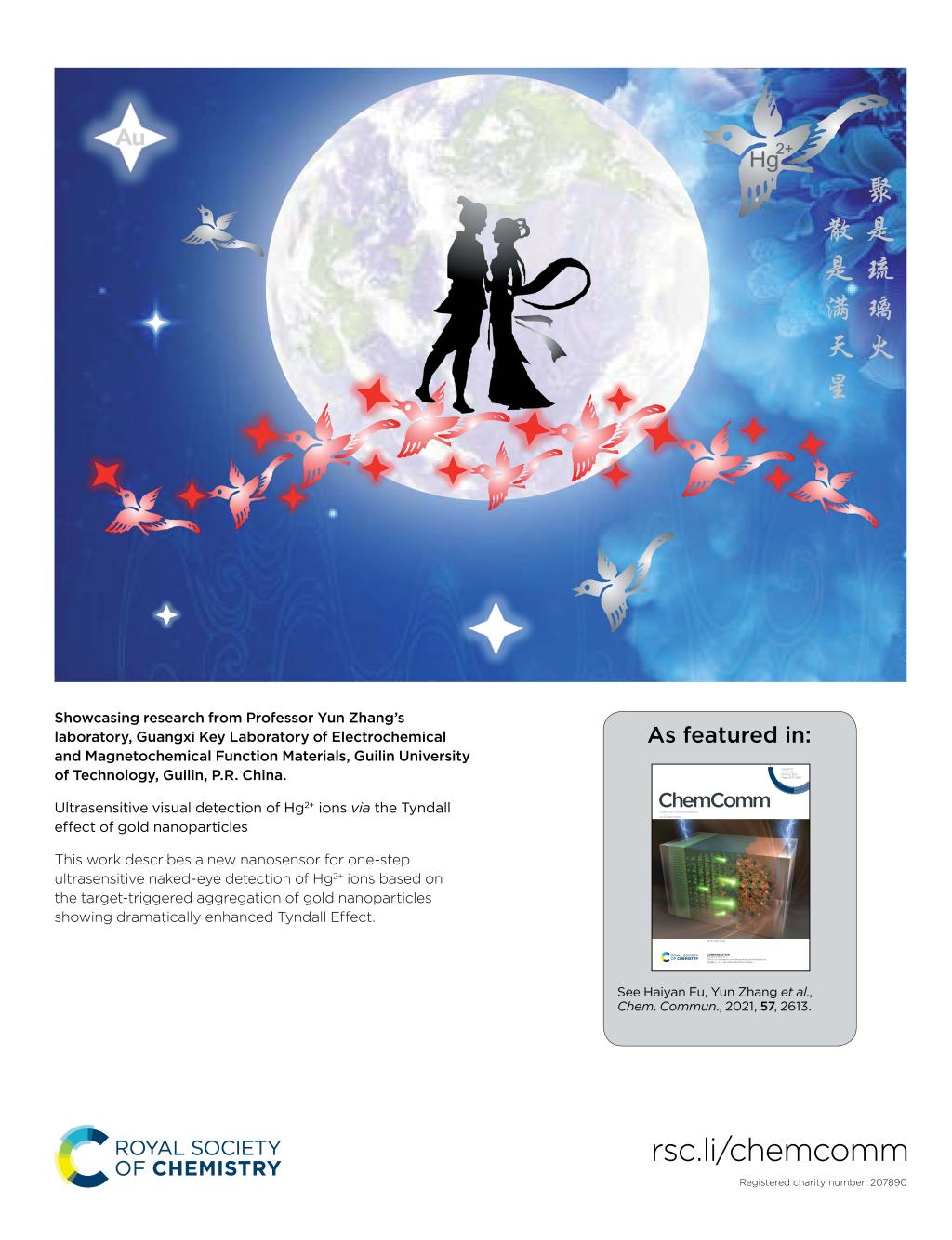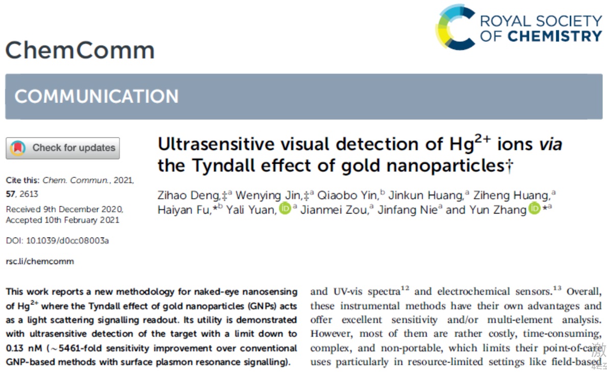 导航痕迹 当前位置: 首页 >> 科学研究 >> 学术动态 >> 正文 我院张云教授课题组在POCT研究领域取得重要进展 作者:张云 发布日期:2021-08-25 浏览次数: 即时检测(POCT,point-of-care testing)泛指一类利用便携式设备及配套试剂实现现场快速检测分析的新方法。该方法具有成本经济、操作简单、检测快速等突出优点,尤其适用于偏远地区、突发事件现场、家庭自检等资源有限环境下进行疾病诊断、环境污染监测和食品安全分析。然而,真正成功实现商品化且进入千家万户的仅有血糖仪等屈指可数的POCT产品,远不能满足人们日益增长的健康提升需要。事实上,发展新型POCT方法已成为21世纪人类在分析化学领域面临的最重大挑战之一。 光散射是自然界中一种常见的光学现象,如晚霞、蓝天等。丁达尔效应(TE,Tyndall effect)则是一种发生在胶体溶液中的光散射现象——当一束光线透过此类溶液时,从垂直入射光方向可以观察到一条因胶体颗粒对光线散射后形成的光亮“通路”。尽管国内外已有少量报道利用TE开展某些溶液体系的纳米水平团聚行为或胶体催化剂形成过程的定性研究,但其高效的比色信号转换特性及相关分析应用潜力还远远未被充分认识和开发。 受此类自然现象的产生主要依赖胶体颗粒浓度和尺寸的启发,我院张云教授和中南民族大学付海燕教授合作,以纳米金为模型胶体体系,首次发展了一种基于TE的高毒害性Hg2+离子高灵敏POCT可视化检测新方法。纳米金经自组装修饰Tween-20后可在高浓度盐溶液中稳定单分散。当样品中存在靶标离子时,该稳定剂分子将因胶体探针表面形成Hg-Au合金而脱落;后者随即发生团聚并生成更大尺寸的复合物,最终导致反应溶液的TE明显增强。研究结果表明,新方法仅需使用一只激光笔(作为手持式光源)和一台智能手机(用于TE成像)即可测定浓度低至0.13 nM的Hg2+离子,比基于表面等离子体共振原理且依赖大型光学仪器的传统比色分析策略的检测灵敏度显著提高了5400倍以上。 相关成果以“Ultrasensitive visual detection of Hg2+ ions via the Tyndall effect of gold nanoparticles”为题发表在化学领域国际知名期刊Chemical Communication(自然指数收录的82种全球自然科学类顶级期刊之一;影响因子5.996),并被选为当期的OutsideBack Cover(外封底;以中国古代传说“牛郎织女鹊桥相会”为创意)。该项研究得到国家自然科学基金面上项目、广西杰出青年基金、中央引导地方科技发展资金、广西重点研发计划等项目资助。我院硕士研究生邓子豪和讲师金文英为论文共同第一作者,伟德国际1946源于英国为第一通讯单位。 论文链接:https://pubs.rsc.org/en/content/articlehtml/2021/cc/d0cc08003a。 论文发表情况 基于TE和纳米金(GNP)的Hg2+离子POCT分析原理示意图 Outside Back Cover(外封底) 上一条:我院温玉清老师课题组在镁合金表面超疏水涂层领域取得重要进展 下一条:【重点实验室】广西电磁化学功能物质重点实验室(区级)