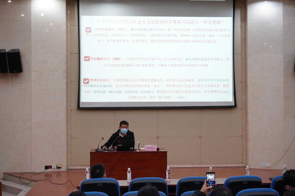 导航痕迹 当前位置: 首页 >> 党建工作 >> 新时代高校党建“双创”工作专栏 >> 正文 【标杆院系】学院党委书记彭代江为全院教职工上主题党课 作者:熊艳 发布日期:2022-12-08 浏览次数: 为充分认识学习宣传贯彻党的二十大精神的重大意义,全面准确学习领会党的二十大精神,12月8日上午,学院党委书记彭代江在雁山校区萃华楼报告厅为全体教职工上“以中国式现代化全面推进中华民族伟大复兴---学习贯彻党的二十大精神”专题党课。 彭代江书记结合学院工作实际从三个方面与大家共同探讨了如何学习贯彻党的二十大精神。一是总体框架及其逻辑、论断--从”总体框架“角度读党的二十大报告,二是主题结构及其亮点--从“主题”角度读党的二十大报告,三是新思想及其深层逻辑--从“逻辑”角度读党的二十大报告。彭书记指出大家要全面准确领会党的二十大精神,坚持学字在前、干字当头,要把自己摆进去,把职责摆进去,把工作摆进去,要结合个人成长和工作实际进一步往深里学、往实里学,确保将党的二十大精神落实到位。 通过此次党课,全院教职工深刻领会了报告的意义及内涵,并表示会将其转化为工作实绩实效,踏实肯干,敢于创新,关注学生的健康成长和全面发展,为社会培养更多高素质人才,助力学校提升办学质量,办好人民满意的教育。 党课现场 上一条:【标杆院系】1946伟德国际源自英国举办“信仰启航,青春飞扬”2022级新生入党启蒙教育专题党课 下一条:【样板支部】化学与化工教工党支部召开学习“党的二十大精神”主题会议