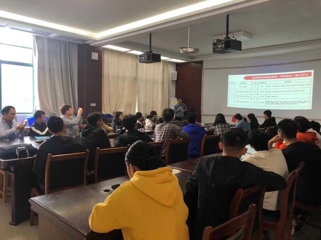 导航痕迹 当前位置: 首页 >> 招生就业 >> 招聘信息 >> 正文 中科(广东)炼化有限公司来我院开展专场招聘会 作者:梁精华 发布日期:2020-10-14 浏览次数: 10月14日,中国石化中科炼化有限责任公司来到我院召开专场招聘会。招聘会在雁山校区12栋萃华楼12217多功能厅召开,我院化学工程与工艺、应用化学专业共计30名在校毕业生参加招聘会。 宣讲会伊始,同学们共同观看了中国石化中科炼化有限责任公司宣传片。接着,企业代表从公司概况、组织架构、福利待遇、日常生活、当地政策等方面做了详细介绍,并针对同学们提出的问题进行了相应解答。 据悉,中国石化中科炼化有限责任公司是中国石油化工集团有限公司旗下子公司,经营业务包括原油进口、加工;石油产品、石化产品的生产、储存、销售;食品添加剂硫磺的生产、储存、销售;成品油出口,来料加工;自用码头、油库的建设、经营;油品储存;产品运输配套服务,是一家集研发、生产、销售新能源材料(锂离子电池电解液、铝塑膜)于一体的国家高新技术企业。 中科(广东)炼化负责人为毕业生作招聘宣讲 招聘宣讲会现场 上一条:广西梧州中恒集团股份有限公司到我院洽谈合作事宜并开展专场招聘毕业生活动 下一条:诺德投资股份有限公司来我院开展专场宣讲会