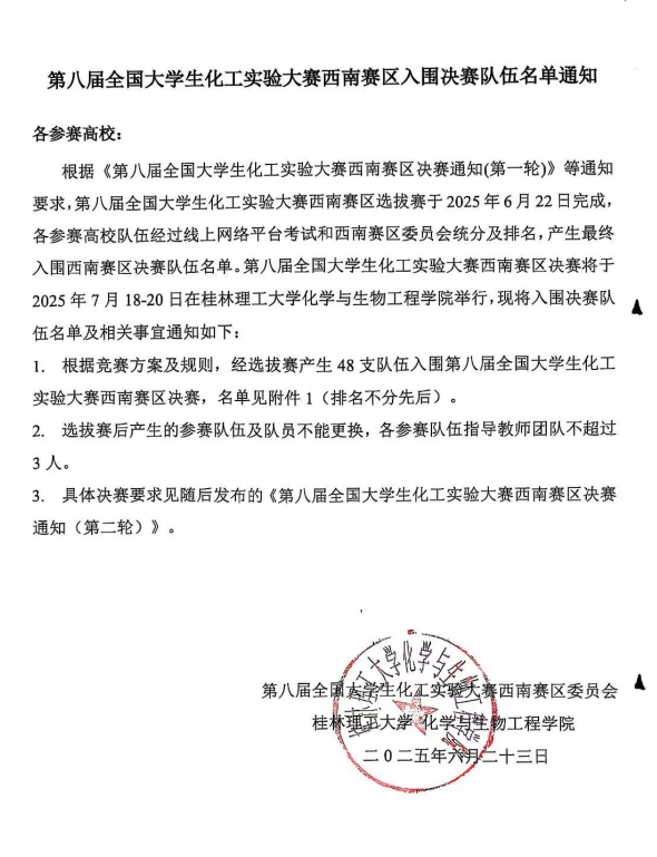 导航痕迹 当前位置: 首页 >> 教育教学 >> 第八届全国大学生化工实验大赛西南赛区专栏 >> 正文 第八届全国大学生化工实验大赛西南赛区入围决赛队伍名单通知 【 发布日期:2025-06-24 浏览次数: 】 上一条:第八届“中控杯”全国大学生化工实验大赛西南赛区决赛通知 (第三轮)